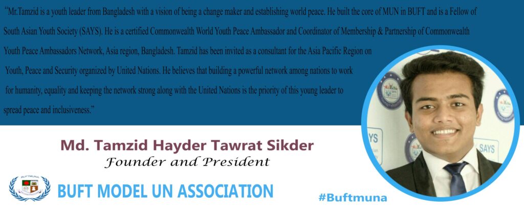 I urge each and every one of you to actively participate, engage with your fellow members, and make the most out of what BUFTMUNA has to offer. Together, we can continue to uphold the values of diplomacy, cooperation, and mutual understanding that lie at the heart of our organization.